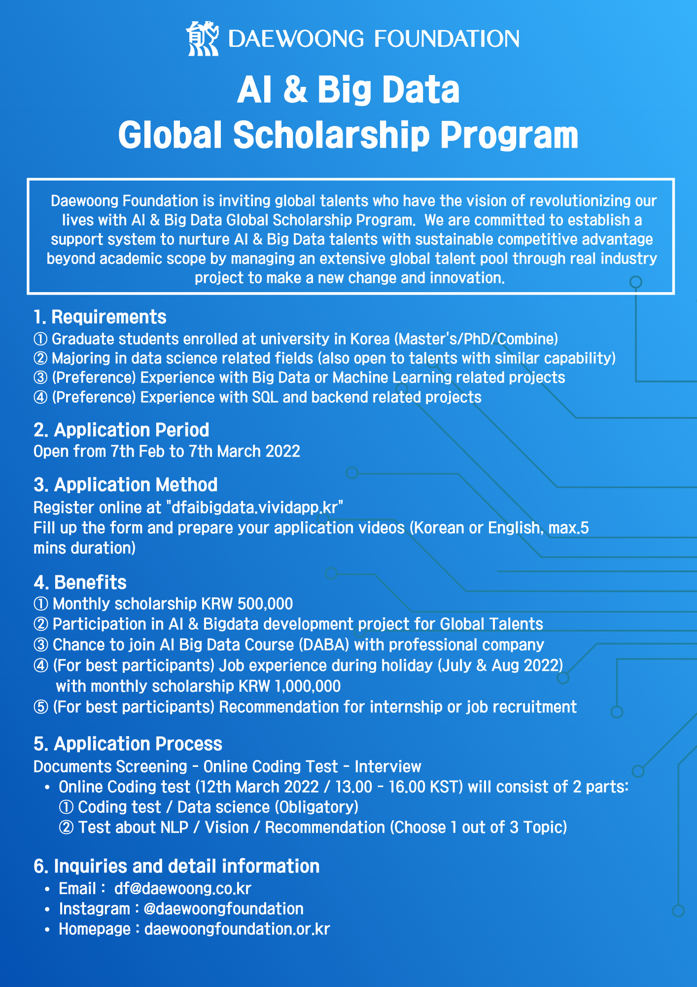 | ÷ºÎÆÄÀÏ 2022 Daewoong Foundation AI Big Data Scholarship - Application Form (Áö¿ø¼).docx 20211202 AI & BIG DATA ±Û·Î¹ú ÀåÇÐ ÇÁ·Î±×·¥ 3±â - °ø°í¹®.pdf | ||||||