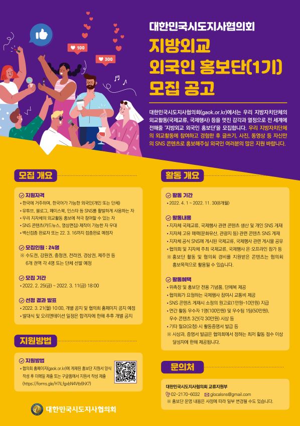 ´ëÇѹα¹½ÃµµÁö»çÇùÀÇȸ(gaok.or.kr)¿¡¼´Â ¿ì¸® Áö¹æÀÚÄ¡´ÜüÀÇ ¿Ü±³È°µ¿(±¹Á¦±³·ù, ±¹Á¦Çà»ç) µîÀ» ¸ÚÁø °¨°¢°ú ¿Á¤À¸·Î Àü ¼¼°è¿¡ ÀüÇØÁÙ ¡®Áö¹æ¿Ü±³ ¿Ü±¹ÀÎ È«º¸´Ü¡¯À» ¸ðÁýÇÕ´Ï´Ù. ¿ì¸® Áö¹æÀÚÄ¡´ÜüÀÇ ¿Ü±³È°µ¿¿¡ Âü¿©ÇÏ°í °æÇèÇÑ ÈÄ ±Û¾²±â, »çÁø, µ¿¿µ»ó µî ÀڽŸ¸ÀÇ SNS ÄÜÅÙÃ÷·Î È«º¸ÇØÁÖ½Ç ¿Ü±¹ÀÎ ¿©·¯ºÐÀÇ ¸¹Àº Áö¿ø ¹Ù¶ø´Ï´Ù.