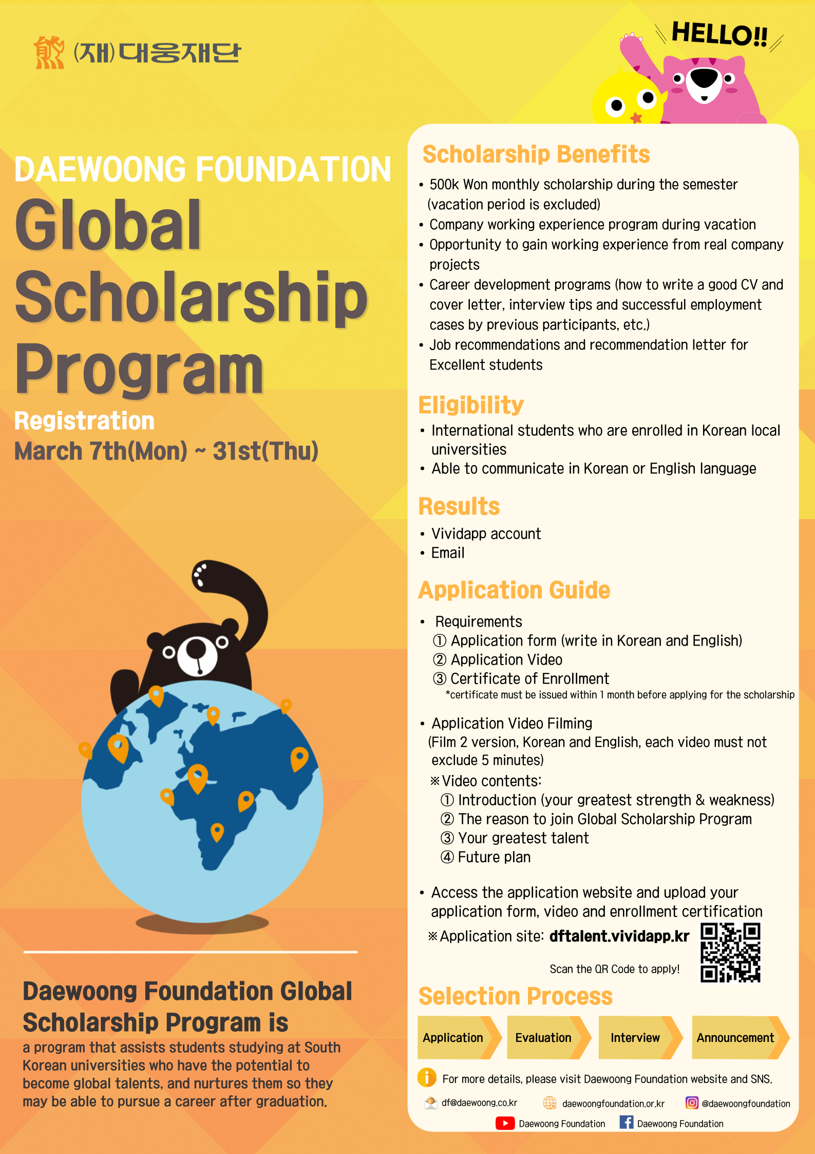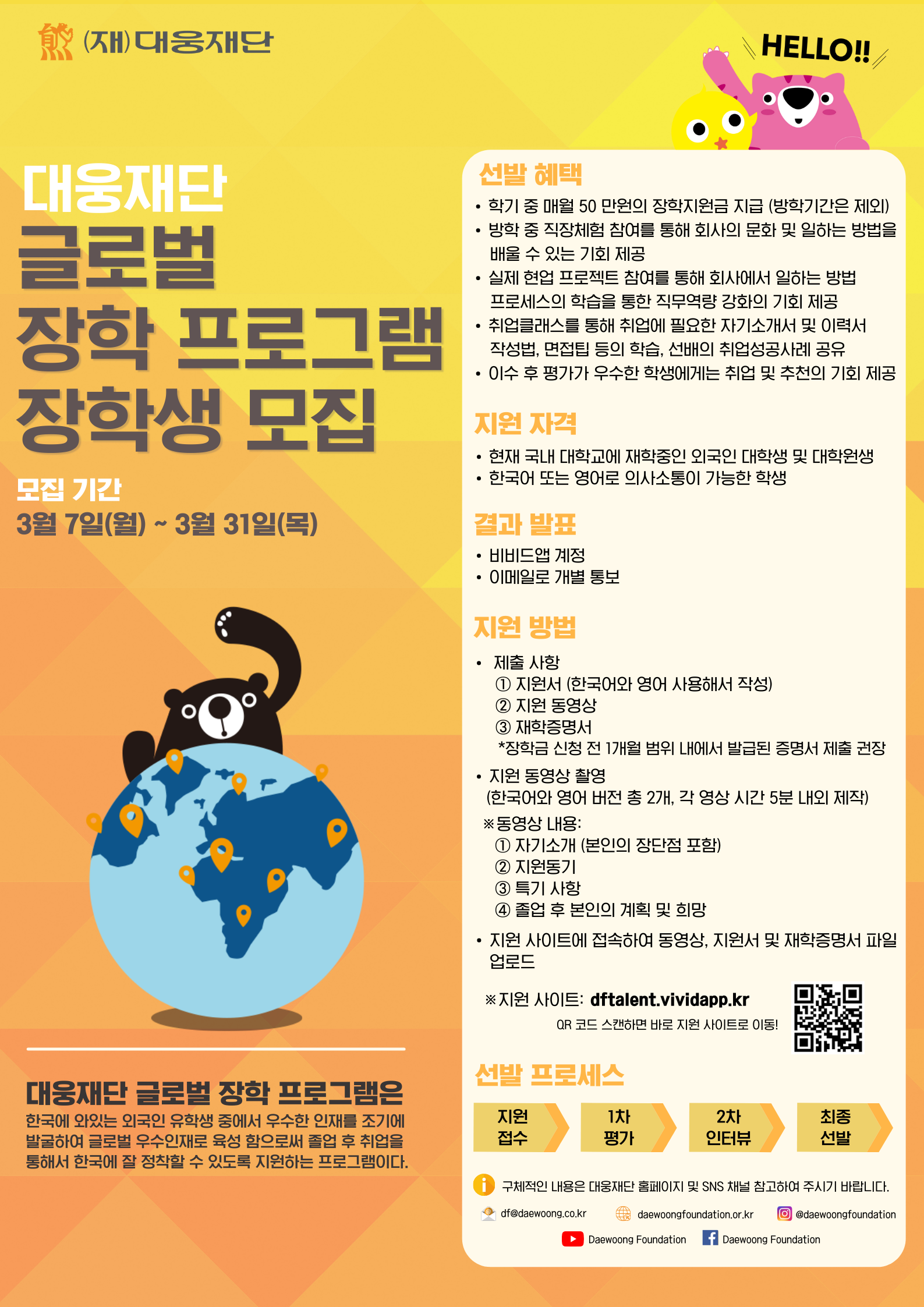 | ÷ºÎÆÄÀÏ 2022 ±Û·Î¹ú ÀåÇÐÇÁ·Î±×·¥ ÀåÇлý ¼±¹ß °ø°í¹®.pdf 2022 Daewoong Foundation Global Scholarship Program Application Form.docx | ||||||