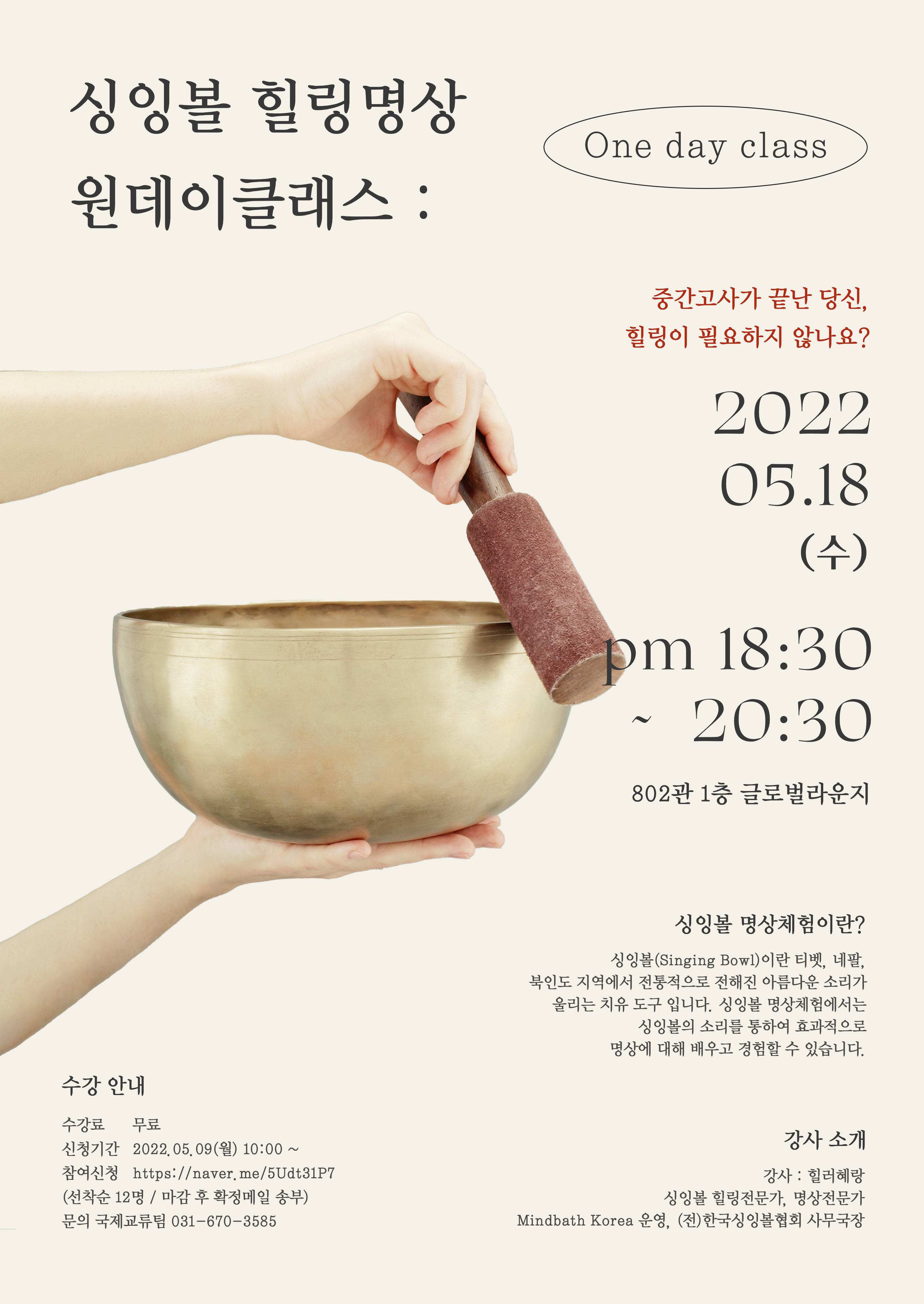 ½ÌÀ׺¼(Singing Bowl)À̶õ Ƽºª, ³×ÆÈ, ºÎÀεµ Áö¿ª¿¡¼ ÀüÅëÀûÀ¸·Î ÀüÇØÁø ¾Æ¸§´Ù¿î ¼Ò¸®°¡ ¿ï¸®´Â Ä¡À¯ µµ±¸ÀÔ´Ï´Ù. ½ÌÀ׺¼ ¸í»óüÇè¿¡¼´Â ½ÌÀ׺¼ÀÇ ¼Ò¸®¸¦ ÅëÇÏ¿© È¿°úÀûÀ¸·Î ¸í»ó¿¡ ´ëÇØ ¹è¿ì°í °æÇèÇÒ ¼ö°¡ ÀÖ½À´Ï´Ù.