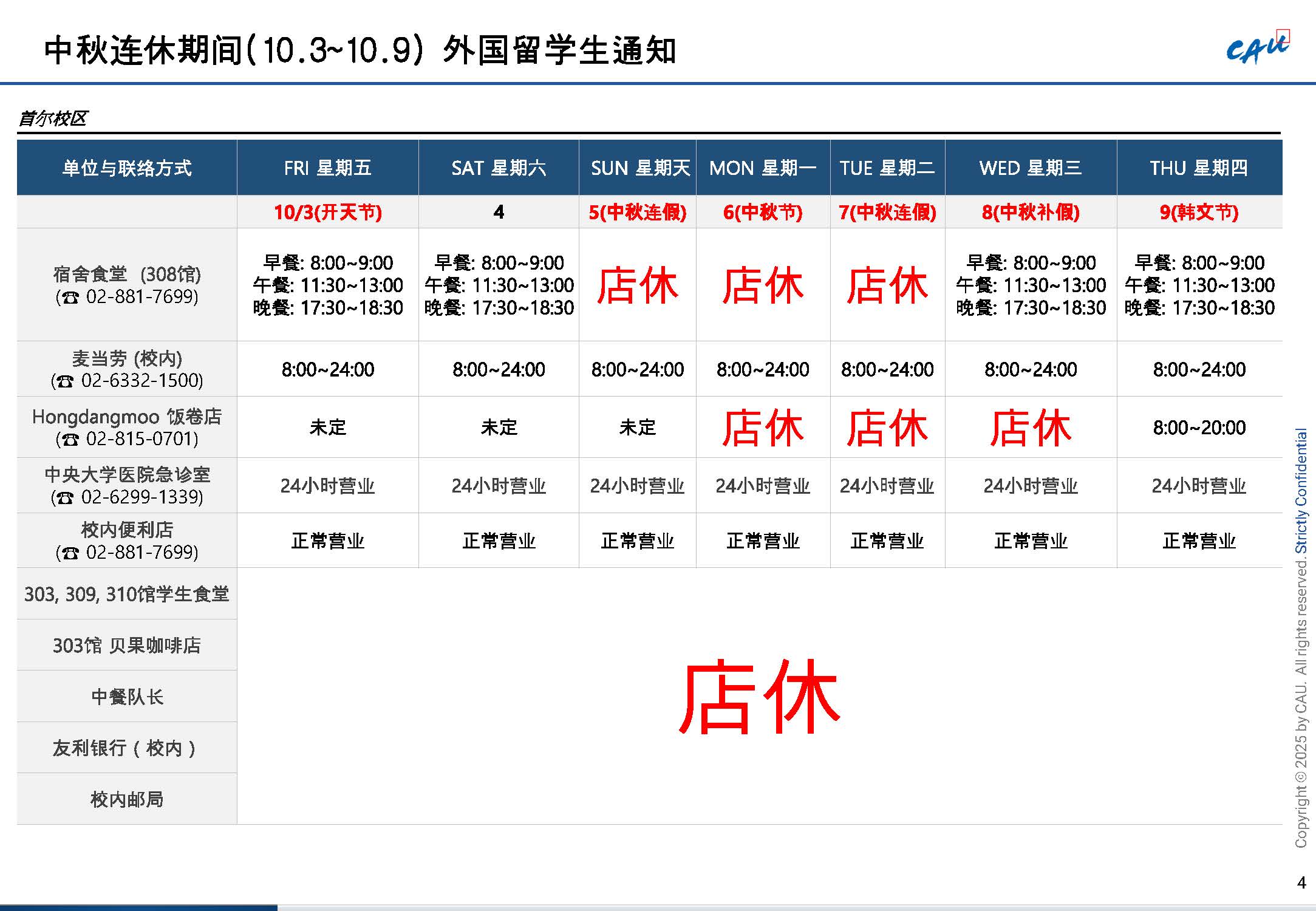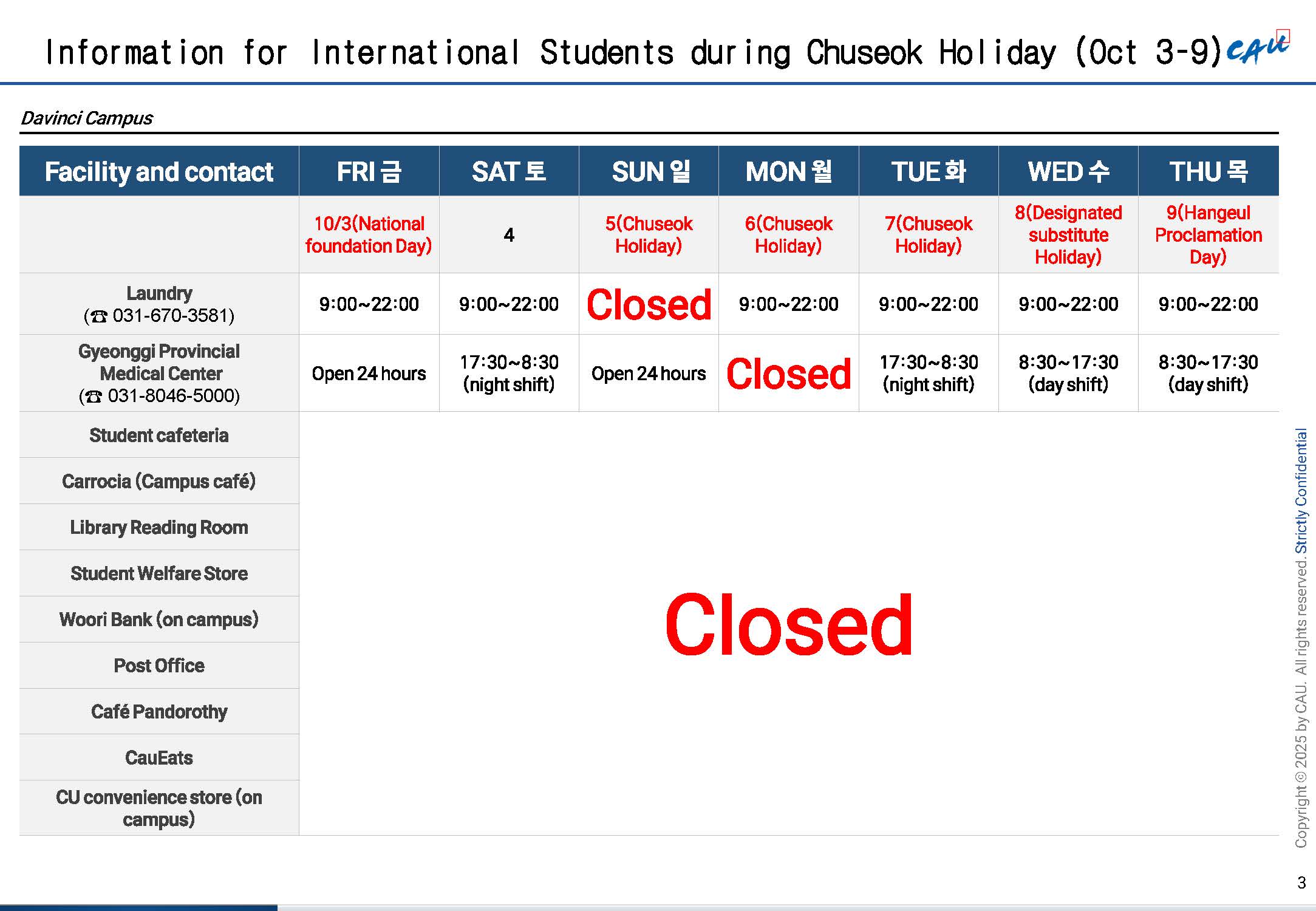 1. Operation of Major CAU Facilities during the Holiday