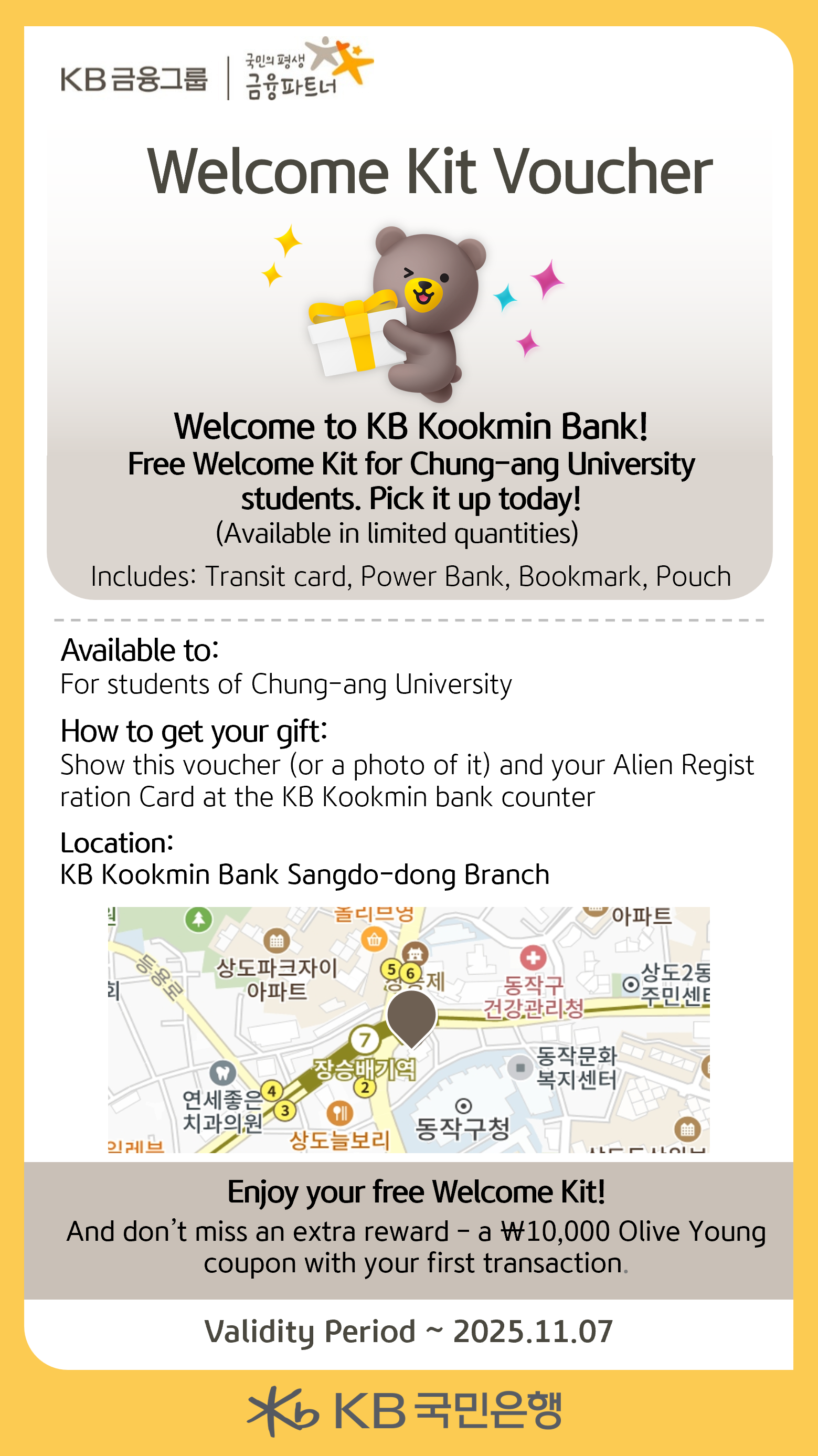 Present the attached voucher and at the designated Kookmin Bank branch and receive a Welcome Kit (Available in limited quantities)